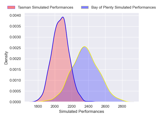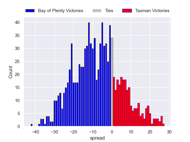 Each club has a rating and a rating deviation (similar to a Glicko rating), and expected performances can be generated. This allows for simulated matches and spreads like the ones below.