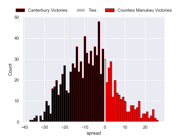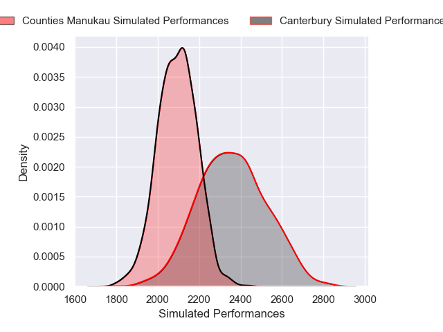 Each club has a rating and a rating deviation (similar to a Glicko rating), and expected performances can be generated. This allows for simulated matches and spreads like the ones below.
