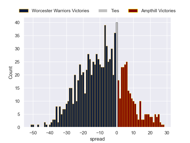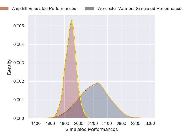 Each club has a rating and a rating deviation (similar to a Glicko rating), and expected performances can be generated. This allows for simulated matches and spreads like the ones below.