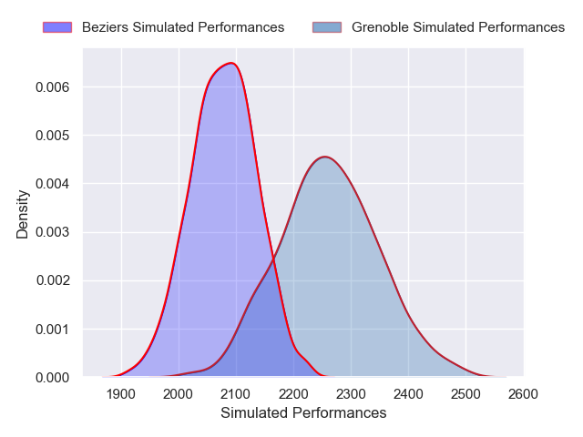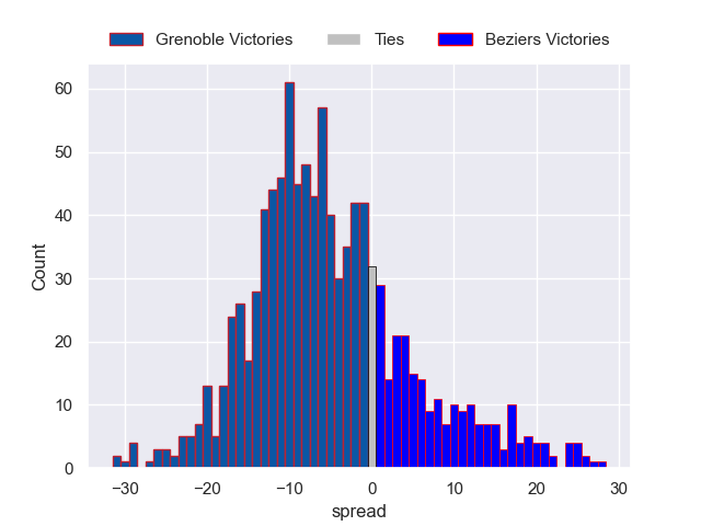 Each club has a rating and a rating deviation (similar to a Glicko rating), and expected performances can be generated. This allows for simulated matches and spreads like the ones below.
