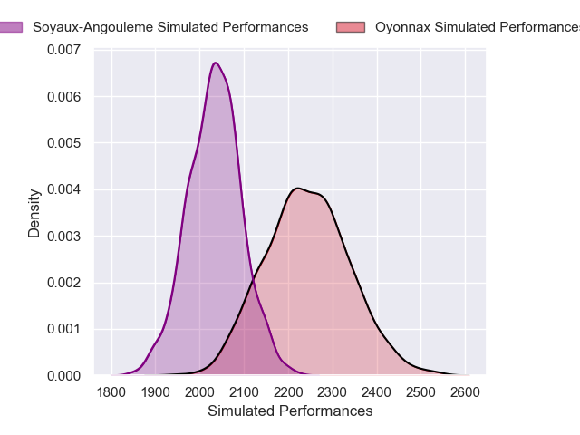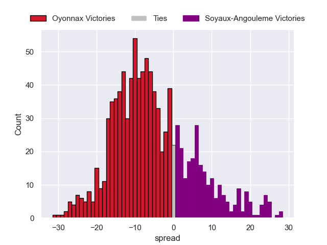 Each club has a rating and a rating deviation (similar to a Glicko rating), and expected performances can be generated. This allows for simulated matches and spreads like the ones below.