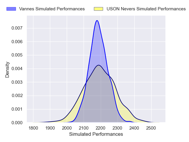 Each club has a rating and a rating deviation (similar to a Glicko rating), and expected performances can be generated. This allows for simulated matches and spreads like the ones below.