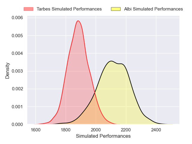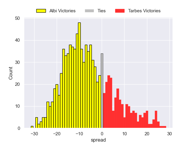 Each club has a rating and a rating deviation (similar to a Glicko rating), and expected performances can be generated. This allows for simulated matches and spreads like the ones below.