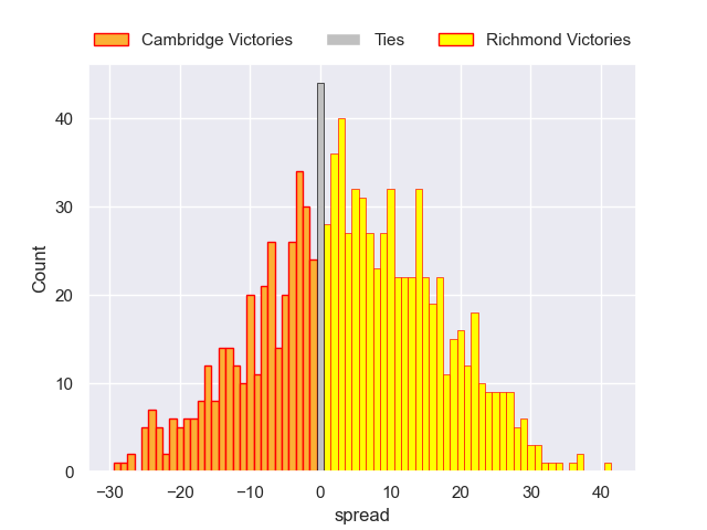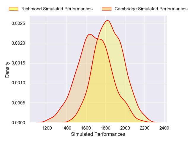 Each club has a rating and a rating deviation (similar to a Glicko rating), and expected performances can be generated. This allows for simulated matches and spreads like the ones below.