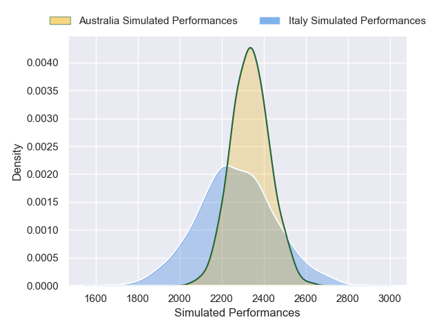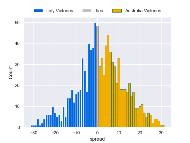 Each club has a rating and a rating deviation (similar to a Glicko rating), and expected performances can be generated. This allows for simulated matches and spreads like the ones below.