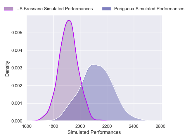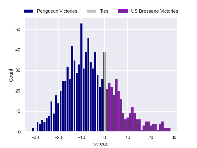 Each club has a rating and a rating deviation (similar to a Glicko rating), and expected performances can be generated. This allows for simulated matches and spreads like the ones below.