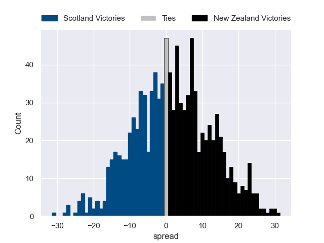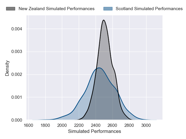 Each club has a rating and a rating deviation (similar to a Glicko rating), and expected performances can be generated. This allows for simulated matches and spreads like the ones below.