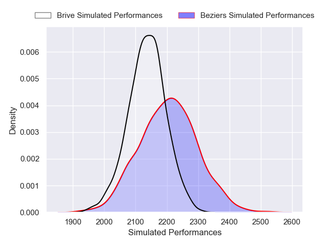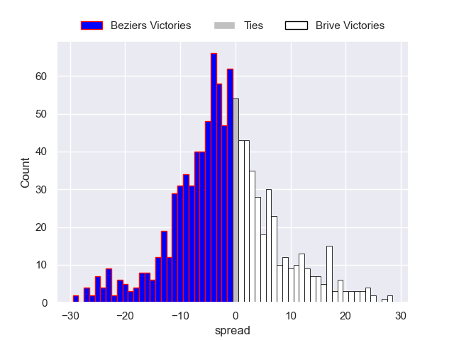 Each club has a rating and a rating deviation (similar to a Glicko rating), and expected performances can be generated. This allows for simulated matches and spreads like the ones below.
