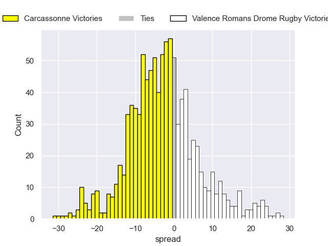Each club has a rating and a rating deviation (similar to a Glicko rating), and expected performances can be generated. This allows for simulated matches and spreads like the ones below.