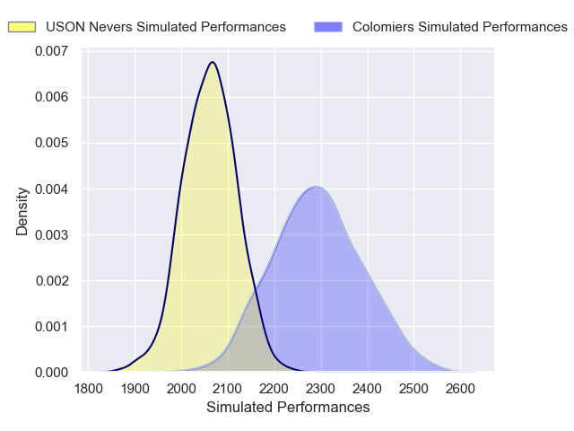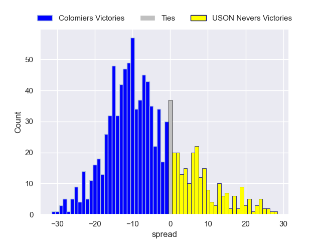 Each club has a rating and a rating deviation (similar to a Glicko rating), and expected performances can be generated. This allows for simulated matches and spreads like the ones below.