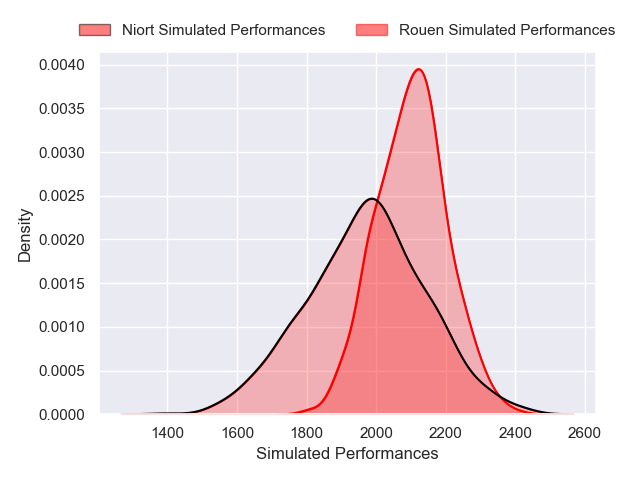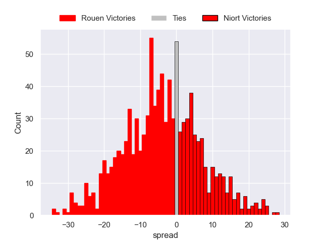 Each club has a rating and a rating deviation (similar to a Glicko rating), and expected performances can be generated. This allows for simulated matches and spreads like the ones below.