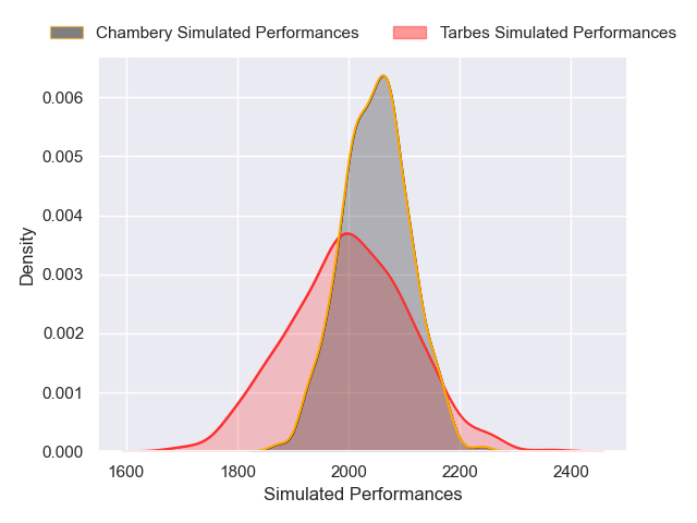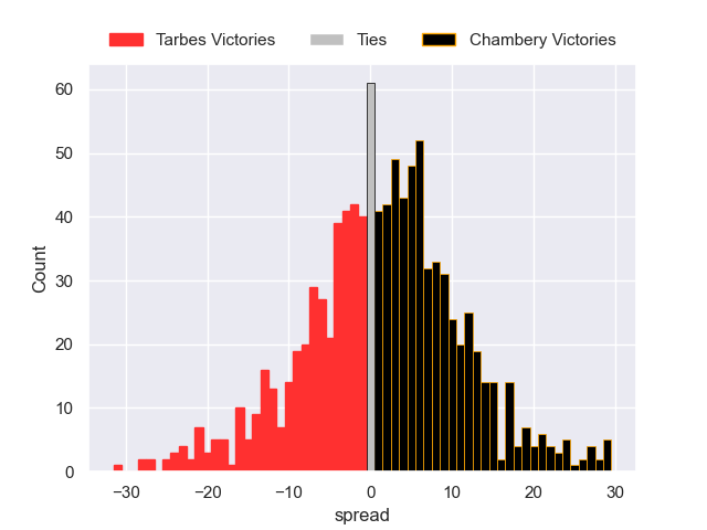Each club has a rating and a rating deviation (similar to a Glicko rating), and expected performances can be generated. This allows for simulated matches and spreads like the ones below.