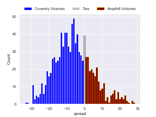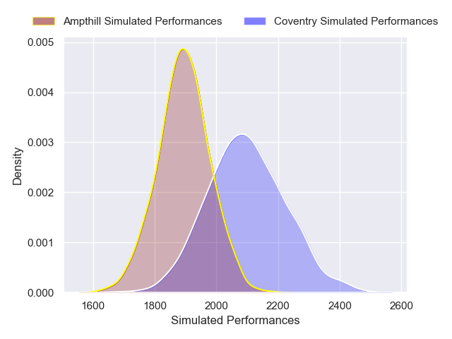 Each club has a rating and a rating deviation (similar to a Glicko rating), and expected performances can be generated. This allows for simulated matches and spreads like the ones below.