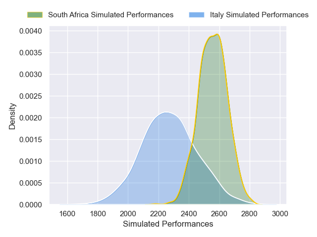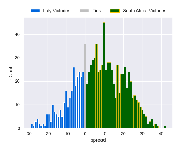 Each club has a rating and a rating deviation (similar to a Glicko rating), and expected performances can be generated. This allows for simulated matches and spreads like the ones below.