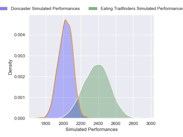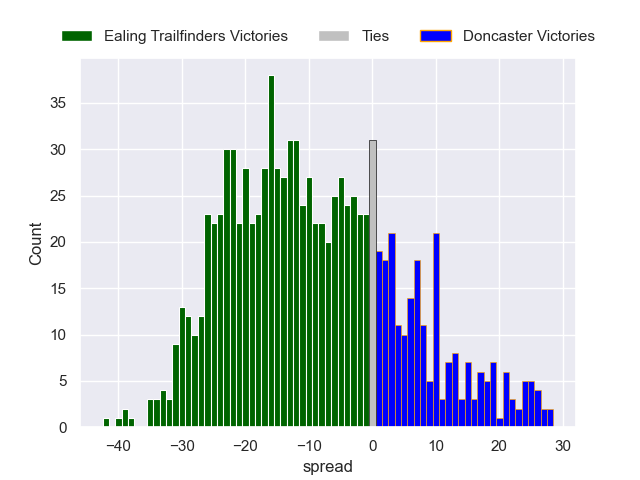 Each club has a rating and a rating deviation (similar to a Glicko rating), and expected performances can be generated. This allows for simulated matches and spreads like the ones below.