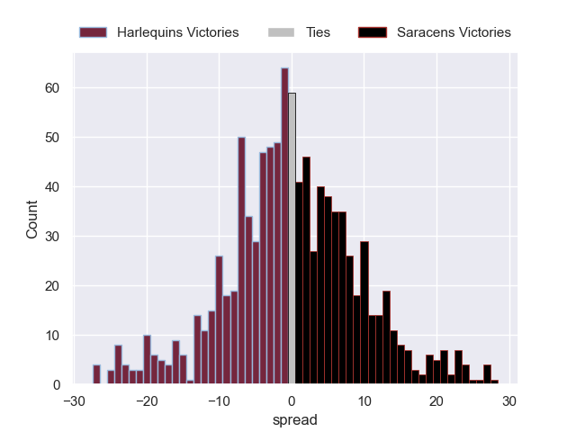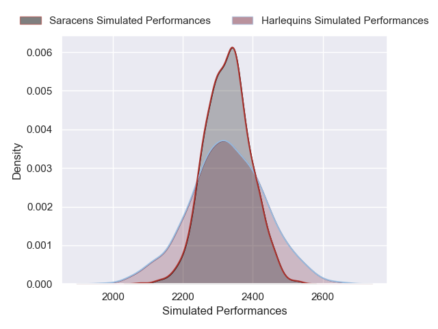 Each club has a rating and a rating deviation (similar to a Glicko rating), and expected performances can be generated. This allows for simulated matches and spreads like the ones below.