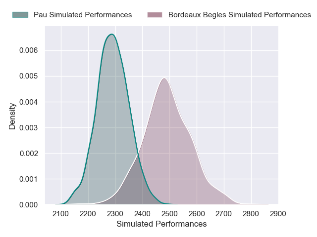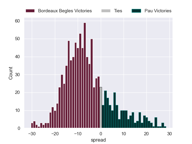 Each club has a rating and a rating deviation (similar to a Glicko rating), and expected performances can be generated. This allows for simulated matches and spreads like the ones below.