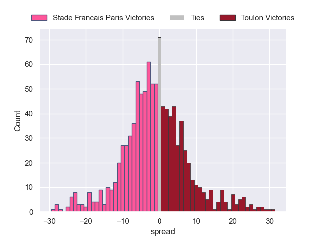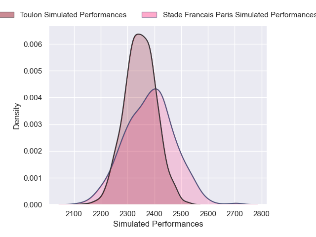 Each club has a rating and a rating deviation (similar to a Glicko rating), and expected performances can be generated. This allows for simulated matches and spreads like the ones below.