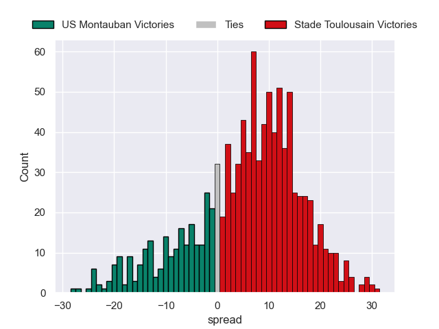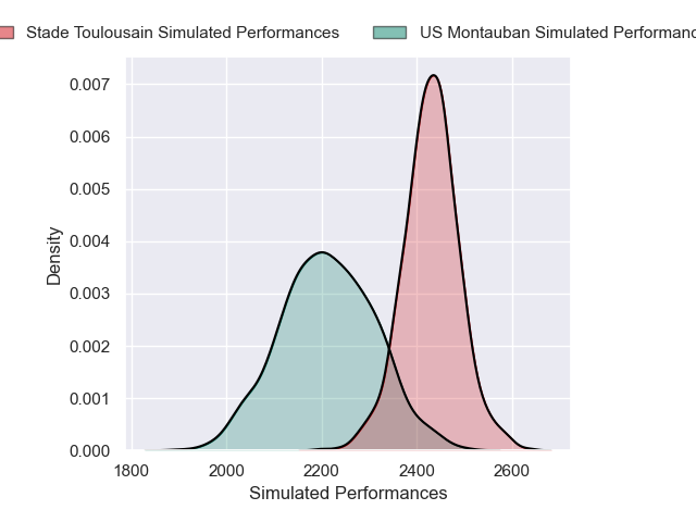 Each club has a rating and a rating deviation (similar to a Glicko rating), and expected performances can be generated. This allows for simulated matches and spreads like the ones below.
