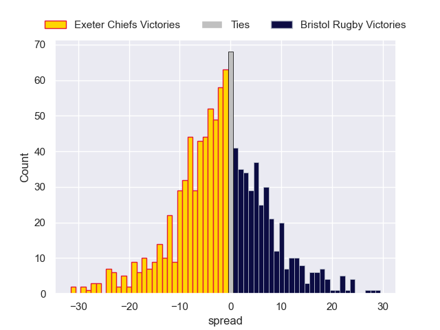 Each club has a rating and a rating deviation (similar to a Glicko rating), and expected performances can be generated. This allows for simulated matches and spreads like the ones below.