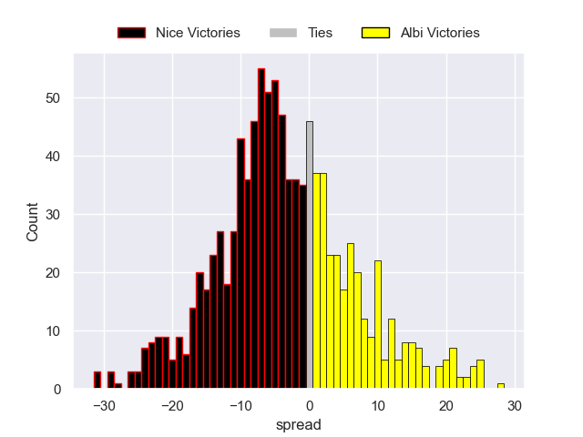Each club has a rating and a rating deviation (similar to a Glicko rating), and expected performances can be generated. This allows for simulated matches and spreads like the ones below.