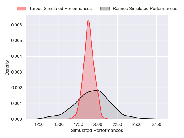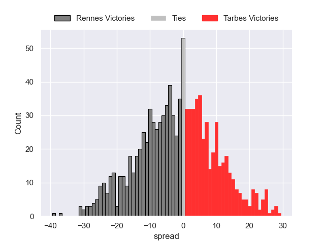 Each club has a rating and a rating deviation (similar to a Glicko rating), and expected performances can be generated. This allows for simulated matches and spreads like the ones below.