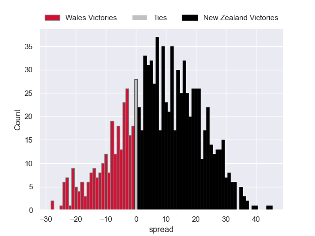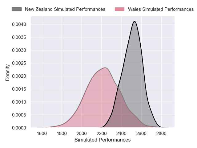 Each club has a rating and a rating deviation (similar to a Glicko rating), and expected performances can be generated. This allows for simulated matches and spreads like the ones below.