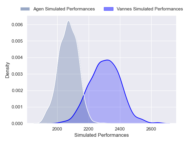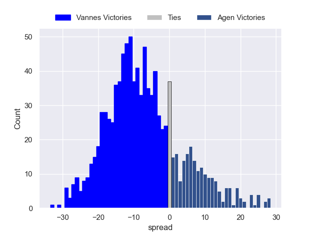 Each club has a rating and a rating deviation (similar to a Glicko rating), and expected performances can be generated. This allows for simulated matches and spreads like the ones below.