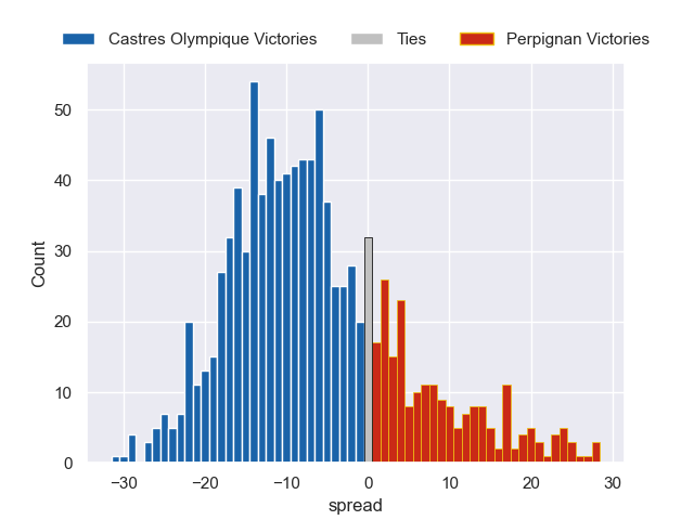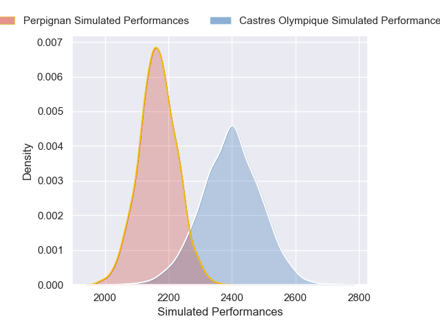 Each club has a rating and a rating deviation (similar to a Glicko rating), and expected performances can be generated. This allows for simulated matches and spreads like the ones below.