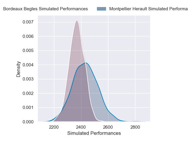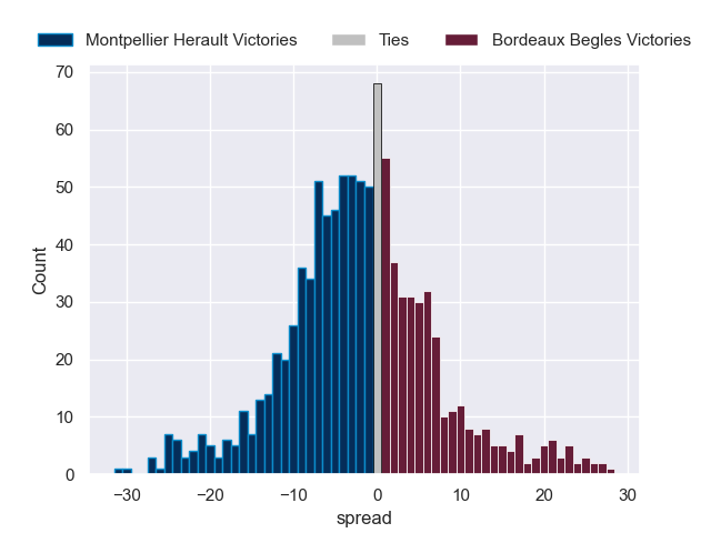 Each club has a rating and a rating deviation (similar to a Glicko rating), and expected performances can be generated. This allows for simulated matches and spreads like the ones below.