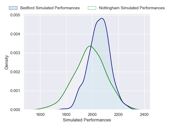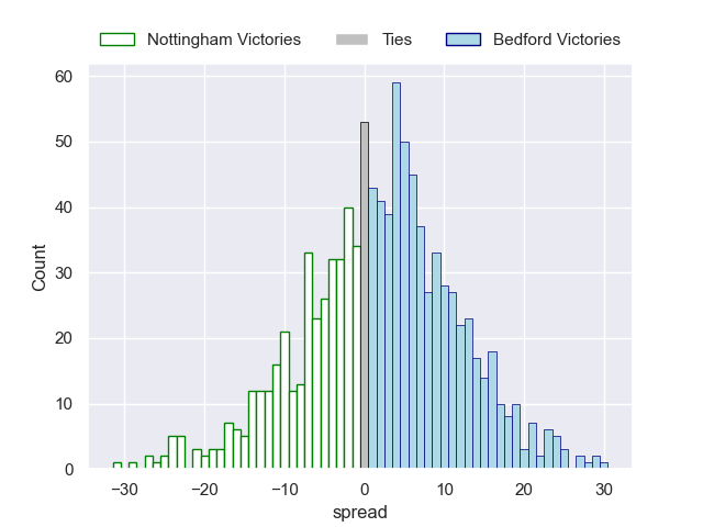 Each club has a rating and a rating deviation (similar to a Glicko rating), and expected performances can be generated. This allows for simulated matches and spreads like the ones below.
