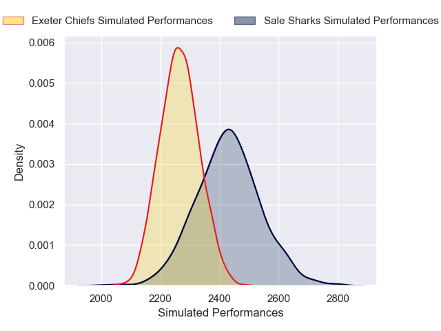 Each club has a rating and a rating deviation (similar to a Glicko rating), and expected performances can be generated. This allows for simulated matches and spreads like the ones below.
