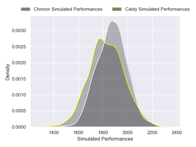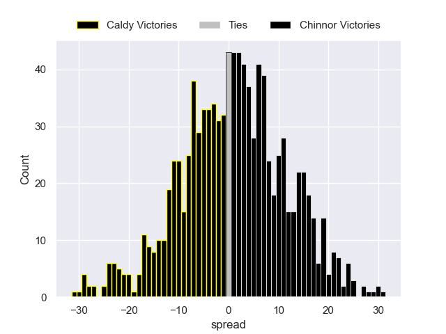 Each club has a rating and a rating deviation (similar to a Glicko rating), and expected performances can be generated. This allows for simulated matches and spreads like the ones below.