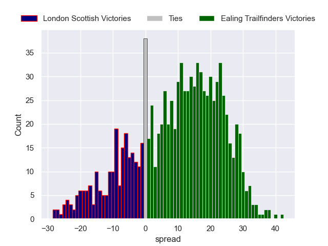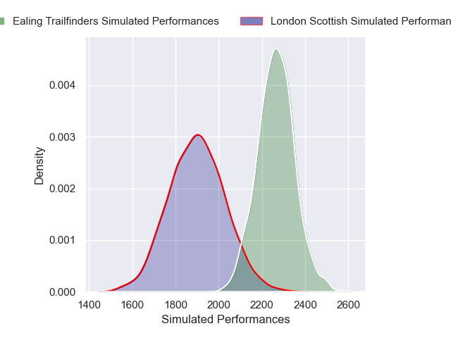 Each club has a rating and a rating deviation (similar to a Glicko rating), and expected performances can be generated. This allows for simulated matches and spreads like the ones below.