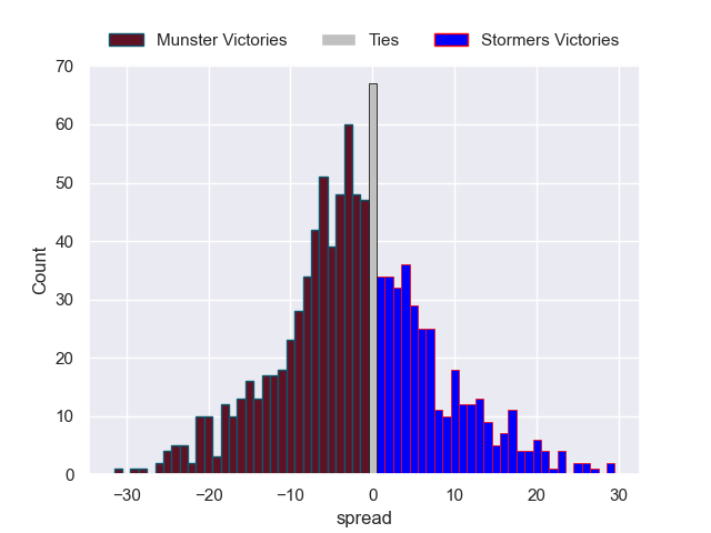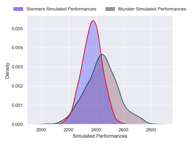 Each club has a rating and a rating deviation (similar to a Glicko rating), and expected performances can be generated. This allows for simulated matches and spreads like the ones below.