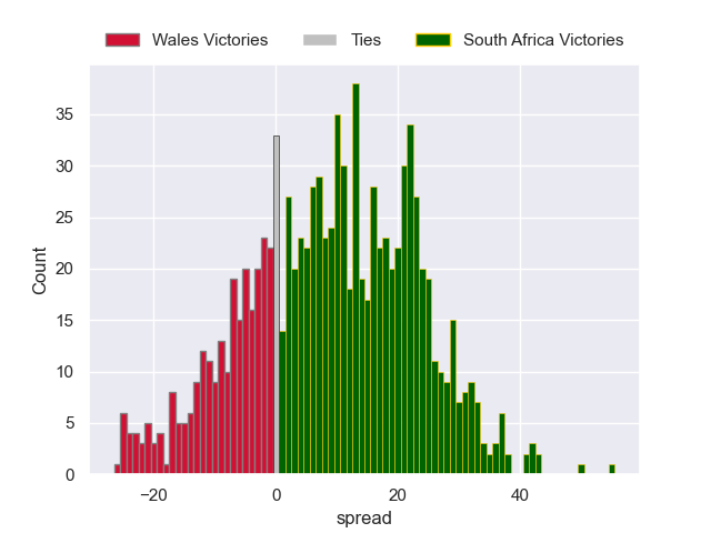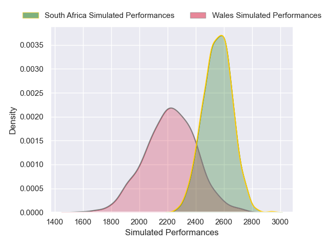 Each club has a rating and a rating deviation (similar to a Glicko rating), and expected performances can be generated. This allows for simulated matches and spreads like the ones below.