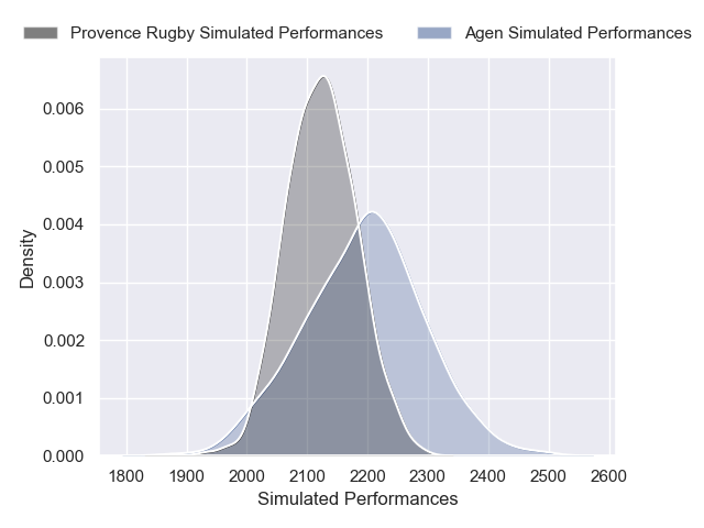 The first set of predictions treats a club as the smallest object, as the club develops its members, organizes a gameplan, and deploys its players as needed for each match. This club model is currently predicting Agen to win by 1.95.