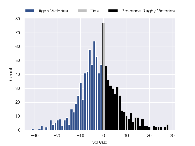 Each club has a rating and a rating deviation (similar to a Glicko rating), and expected performances can be generated. This allows for simulated matches and spreads like the ones below.
