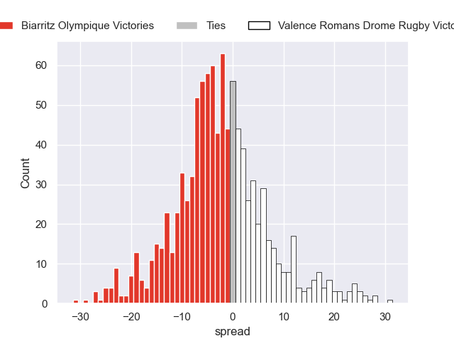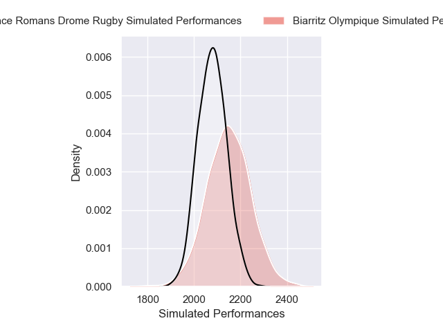 Each club has a rating and a rating deviation (similar to a Glicko rating), and expected performances can be generated. This allows for simulated matches and spreads like the ones below.