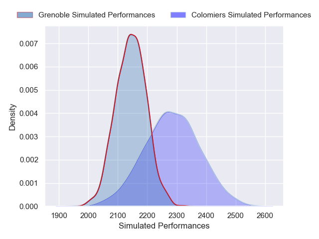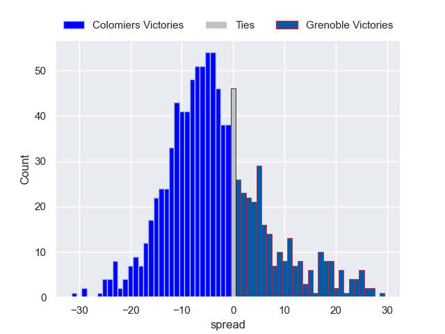 Each club has a rating and a rating deviation (similar to a Glicko rating), and expected performances can be generated. This allows for simulated matches and spreads like the ones below.