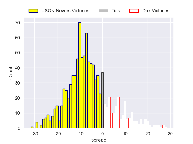 Each club has a rating and a rating deviation (similar to a Glicko rating), and expected performances can be generated. This allows for simulated matches and spreads like the ones below.