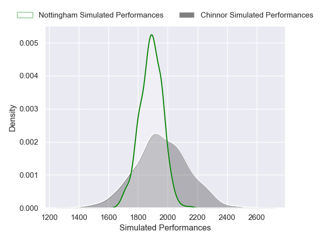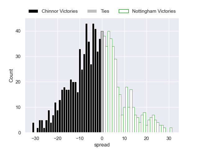 Each club has a rating and a rating deviation (similar to a Glicko rating), and expected performances can be generated. This allows for simulated matches and spreads like the ones below.
