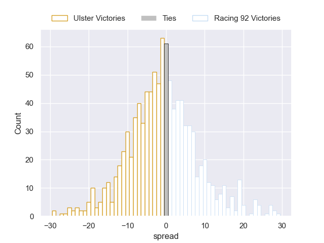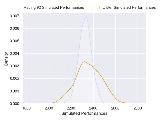 Each club has a rating and a rating deviation (similar to a Glicko rating), and expected performances can be generated. This allows for simulated matches and spreads like the ones below.