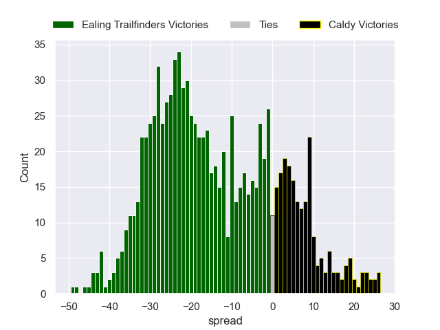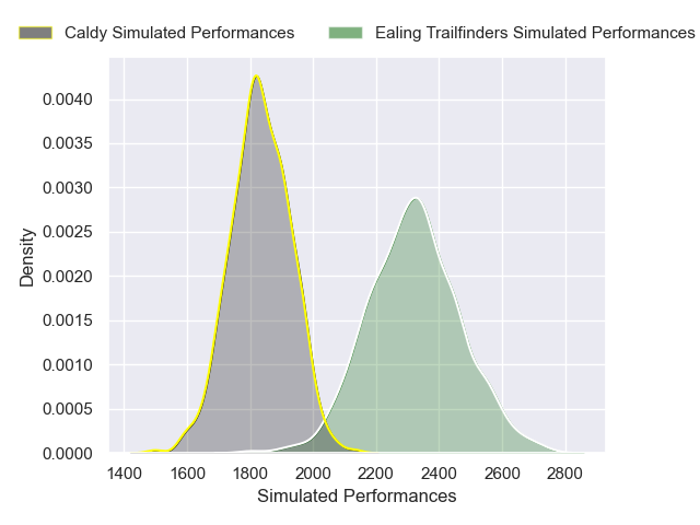 Each club has a rating and a rating deviation (similar to a Glicko rating), and expected performances can be generated. This allows for simulated matches and spreads like the ones below.