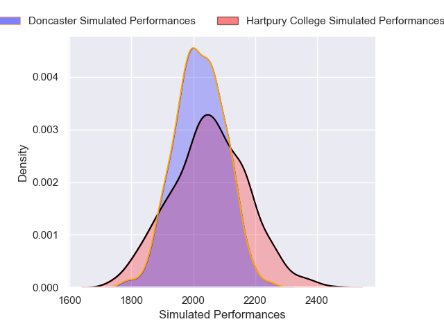 Each club has a rating and a rating deviation (similar to a Glicko rating), and expected performances can be generated. This allows for simulated matches and spreads like the ones below.