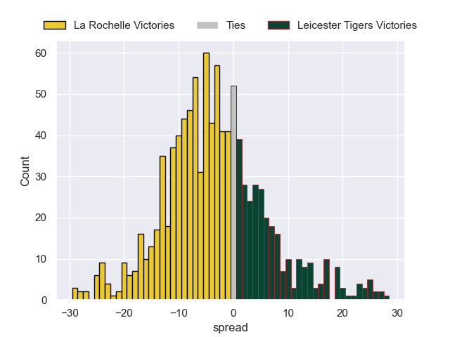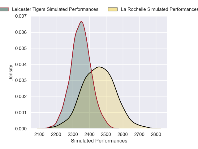 Each club has a rating and a rating deviation (similar to a Glicko rating), and expected performances can be generated. This allows for simulated matches and spreads like the ones below.