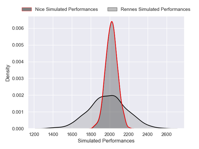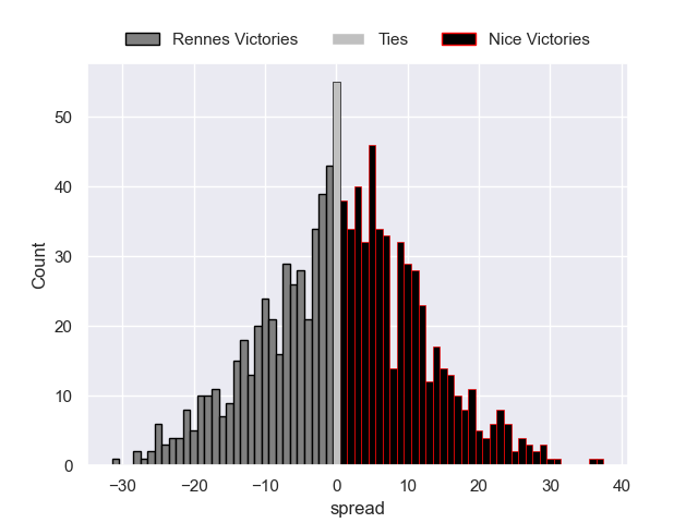 Each club has a rating and a rating deviation (similar to a Glicko rating), and expected performances can be generated. This allows for simulated matches and spreads like the ones below.