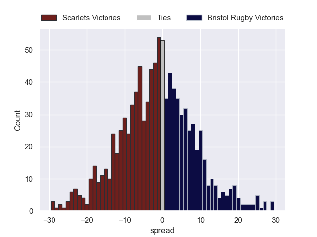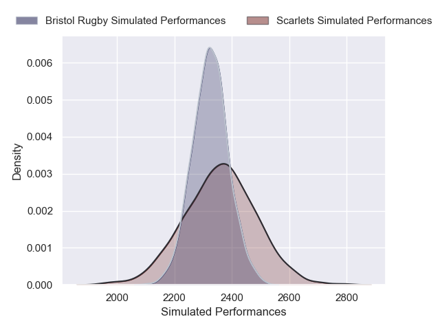 Each club has a rating and a rating deviation (similar to a Glicko rating), and expected performances can be generated. This allows for simulated matches and spreads like the ones below.