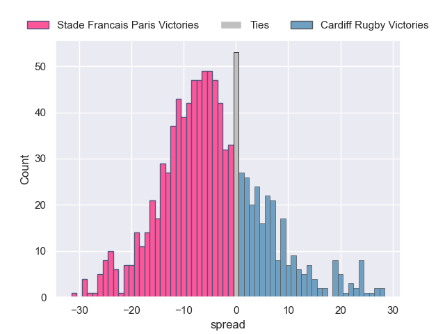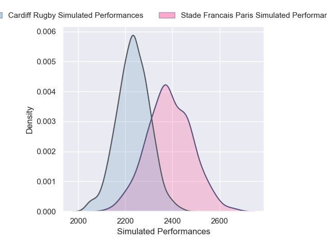 Each club has a rating and a rating deviation (similar to a Glicko rating), and expected performances can be generated. This allows for simulated matches and spreads like the ones below.