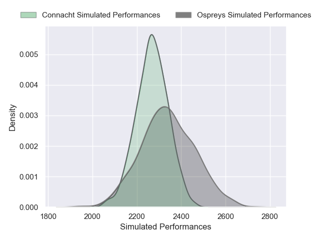 Each club has a rating and a rating deviation (similar to a Glicko rating), and expected performances can be generated. This allows for simulated matches and spreads like the ones below.